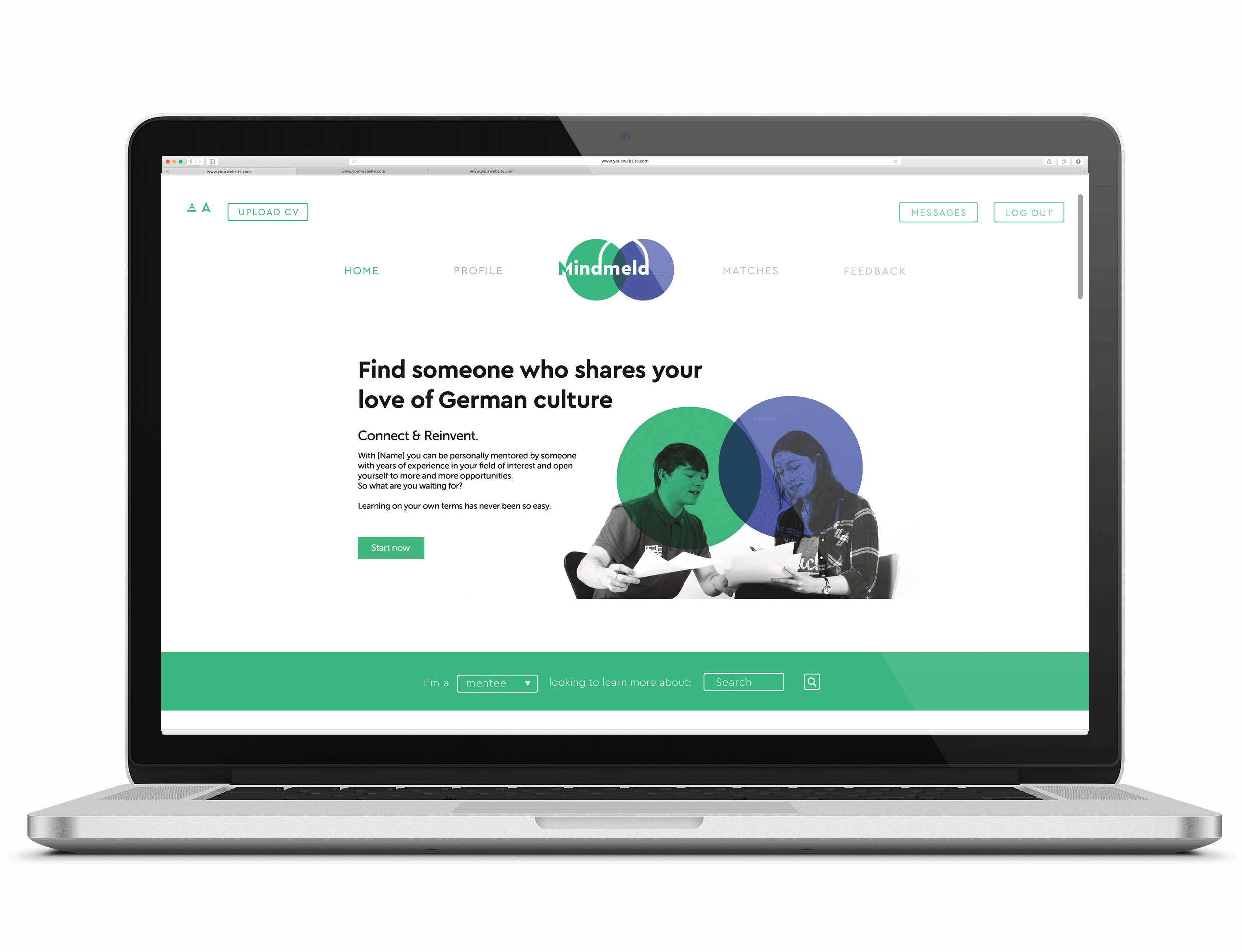 Mindmeld is my concept and design for a web platform for fostering professional growth. It connects mentors and mentees for one-on-one knowledge exchange. Mentees explore new paths, bridge skill gaps, and gain insights, while mentors reflect on their practice and develop leadership skills.